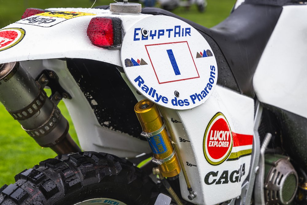 My off-road background means I am a sucker for rally bikes, and this prototype factory works bike was particularly cool. One of three built for the 1991 African rallies, it is hand-built around a kickstart-only Ducati 900SS race engine with sandcast center cases and a raised sump for additional ground clearance. The dry clutch with mesh cover seems an odd decision for sandy desert racing, but it did just fine. Ridden by Danny LaPorte, it took first overall in the 1991 Pharaohs Rally and second overall in the 1992 Dakar Rally. Oh, and it carried 17 gallons of fuel! Photo by Nathan May.