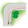 The outside-inside-middle line through a curve, shown by the red line, maximizes how far ahead you can see and gives you a safety cushion. The rider sets up for the righthand curve by positioning close to the centerline, but keeps from drifting too close to the centerline on the exit. Notice that the rider positioned in the right half of the lane cannot see as far through the turn. Illustration by Ken Condon from the book Riding in the Zone.