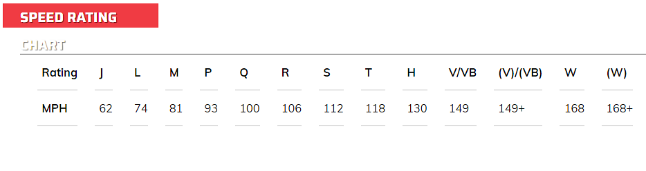 This letter indicates the maximum speed limit that a tire is designed to handle. The chart below translates what each letter stands for in miles per hour.