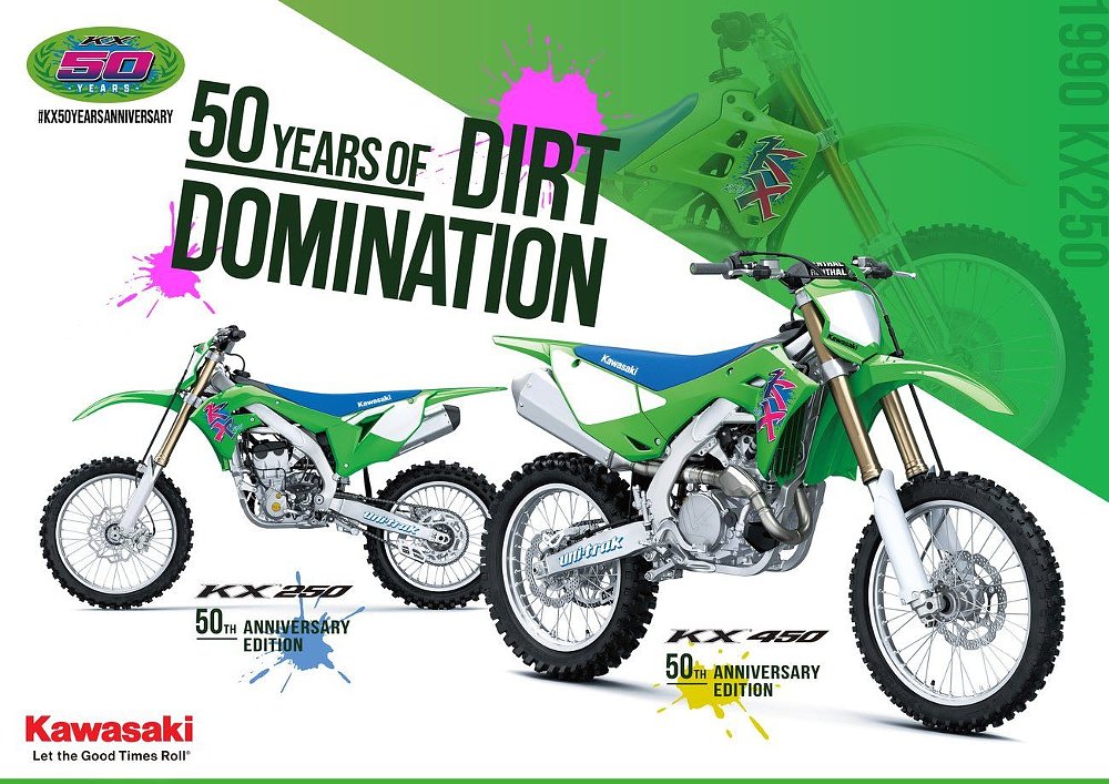 A $200 markup nudges the 2024 KX250 and KX450 50th Anniversary Editions to $9,099 and $10,699, respectively. Kawasaki photo.