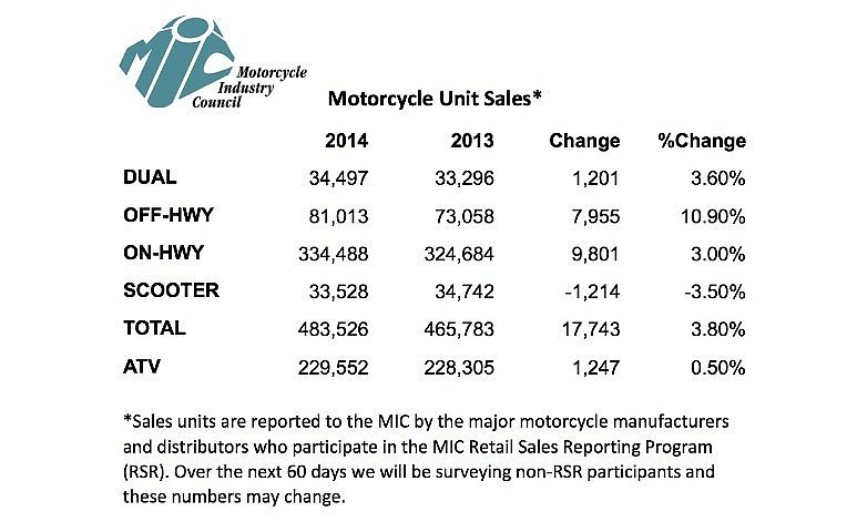 By segment, off-highway bikes saw the most growth, moving 81,013 for a 10.9 percent increase over 2013. Sales of dual-purpose bikes were up 3.6 percent with 34,497 units sold, and on-highway motorcycles are up 3 percent with 334,488 units sold. Scooters were the only category to lose ground, down 3.5 percent from 34,742 to 33,528 units sold.