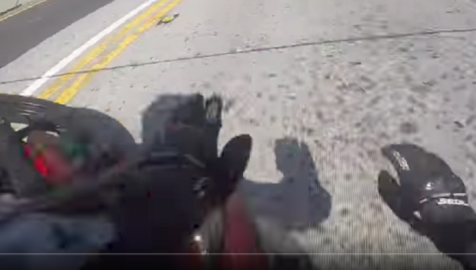 Now desperate to avoid impact with concrete, the rider reaches his hands out in the Superman position, to see if he can fly. He can’t. Luckily, surrounding traffic was moving slowly and he was not run over.