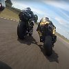 Locked nose to tail, O’Halloran and Ray exit the corner dying to get the edge on the other rider and so each of them breaks into a lurid slide, one after the other, leaving behind tire smoke and the dreams of Pirelli engineers. Again, sliding a slick-shod superbike at triple-digit speeds is something most of us can only dream of. Doing it out of desperation makes it all the more genuine and beautiful.