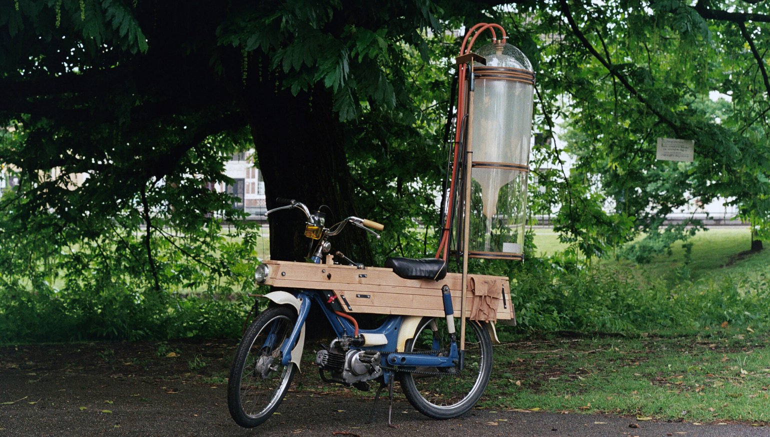 Dutch DIYer Gijs Schalkx decided to explore an alternate source of eco-friendly power: methane gas naturally released by decomposition in bogs and swamps. He heard stories of a fisherman who collected swamp gas while fishing, and then used the captured gas to cook his food. Schalkx successfully built a homemade rig to try gas collection at a nearby bog, so he started converting a Honda PC50 to run on "slootgas" (methane released from roadside ditches and swamps). The result is a bizarre little vehicle he calls “Slootmotor.” Half motorbike, half methane management, Schalkx’s build makes no attempt to hide its unorthodox fuel in its large rear-mounted tank.