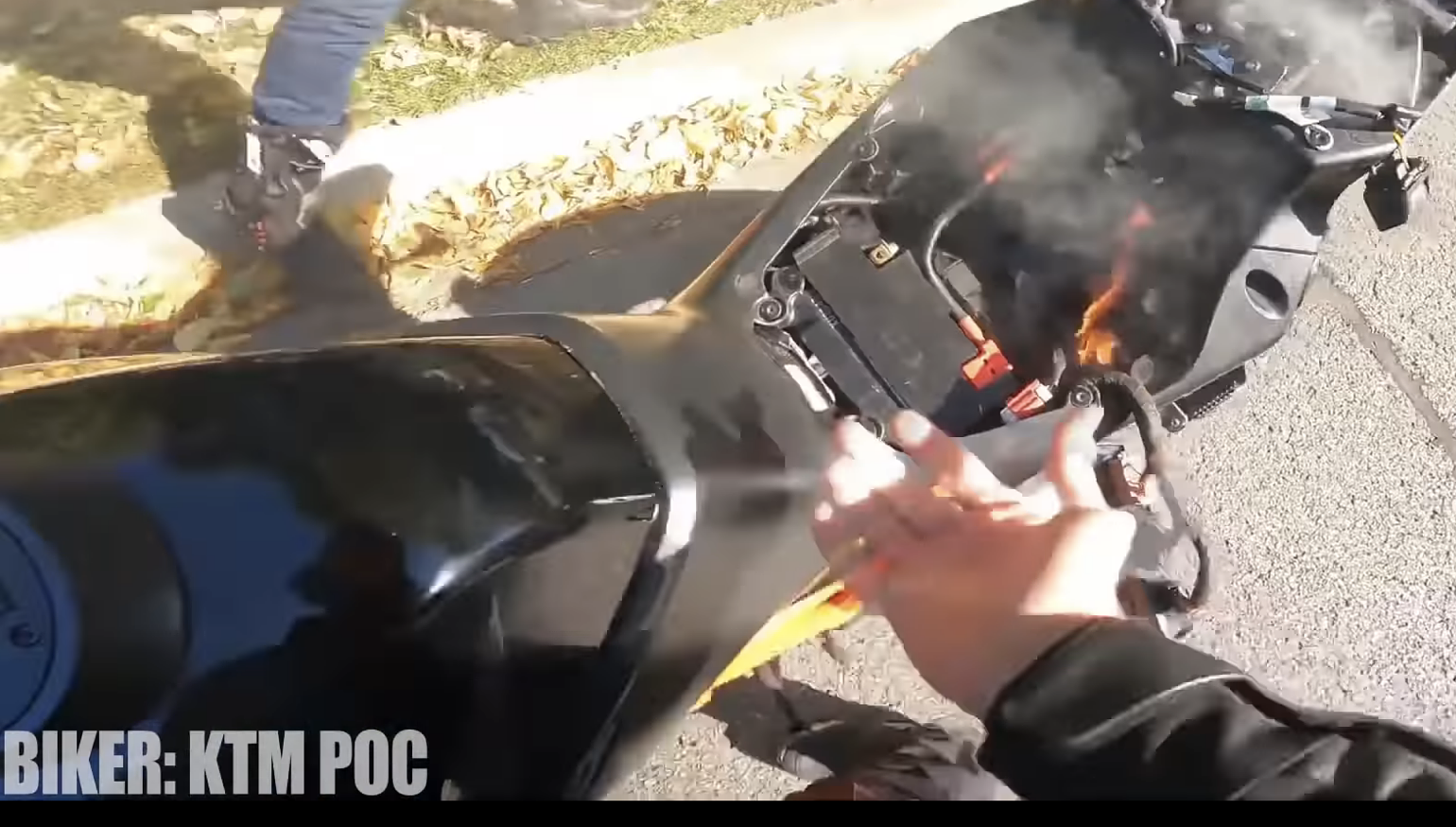 Our two riders are cruising around town when something goes wrong with the KTM 1290 Super Duke. They pull over to investigate as smoke starts curling out from under the seat. The Super Duke's rider holds the clutch in and expresses confusion as the bike’s starter spins uncontrollably, even when they hit the kill switch or turn the bike off. The riders remove the seat and try to pull wires to disconnect the battery, but it doesn’t work, so they try throwing dirt on the burning wires to put out the fire. The bike’s starter spins again while they’re getting more dirt and the riderless bike jumps forward into traffic, though it falls on its side before it can hit a car. They pull the bike back upright and poke at stuff until someone comes along to loan them some tools. The comments seem to suggest that the bike wasn't salvageable.