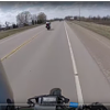 By the time the dog crosses his path, Danny’s slowed enough to give it a few yards. There’s a green sport bike behind Danny, followed by a second camera-equipped bike. The green bike manages to avoid a rear-end collision. Brakes alone suffice; no one has to swerve, but the view from the second camera makes it clear that there’s lots of room on either side of Danny. So far, so good.