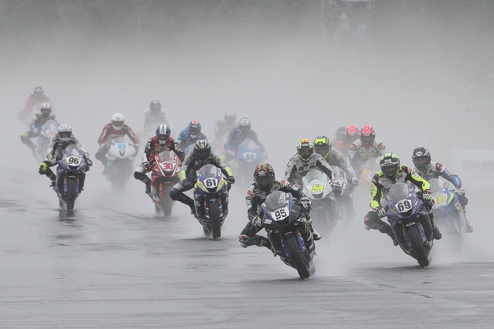 Sunday conditions were far worse. Rain pelted down and puddles formed on the track, leading MotoAmerica to move up race times and shorten distances. Herrin didn't make the start, due to mechanical problems with his Superbike, and Beaubier found some more confidence, riding to a 13.675-second victory over Roger Hayden.