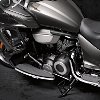 The new Star Venture ($24,999) is built upon a hybrid frame (steel main section with an aluminum subframe). The bike is motivated by a new air-and-oil-cooled engine. The 113 ci (1,854 cc) is an eight-valver, and compression is a healthy 9.5:1. The new mill also sports dual counterbalancers, presumably to keep vibrations mellow. Output is a tarmac-twisting 126 foot-pounds of torque produced at just 2,500 rpm. Hydraulic lifters should remove any need to perform valve adjustments. Power is fed through a six-speed gearbox, and final drive is via a belt. The throttle is electronic (“fly-by-wire”), and Yamaha has also fitted the Star with two throttle modes (touring and sport), in addition to a traction control system. (The Common Tread staff believes this is the first time we’ve seen TC on a full-dress touring outfit.) Brakes are linked, and ABS at this price (and time) probably doesn’t even need to be announced. Cruise control is standard, as is a slip ‘n’ grip clutch. (The clutch offers assist as well as slip function, to provide tamer lever pull.)
