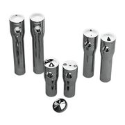 Chrome billet aluminum risers feature the unique concept of a removable cover that hides the upper handlebar clamp bolts. Accepts stock Springer riser studs and nuts. For use with handlebars with a 1" diameter in the clamping area.