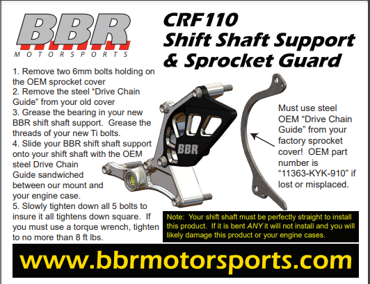 Product Style BBR Motorsports Shift Shaft Brace And Sprocket Guard Honda CRF110F 2013-2026 | RevZilla Item #10144552 | Store Sku | MFR. Product #405-HCF-1110 | AvailabilityIn Stock: Ships within 24 hours |