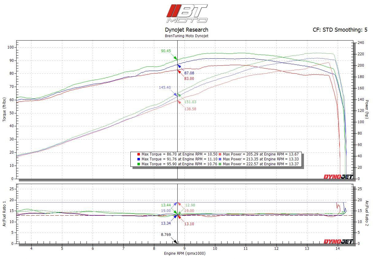 - On average, gains of 7-14HP from the midrange and up were found over the baseline on a typical exhaust/filter bike with 93 octane fuel in the tank (Larger gains with race fuel)