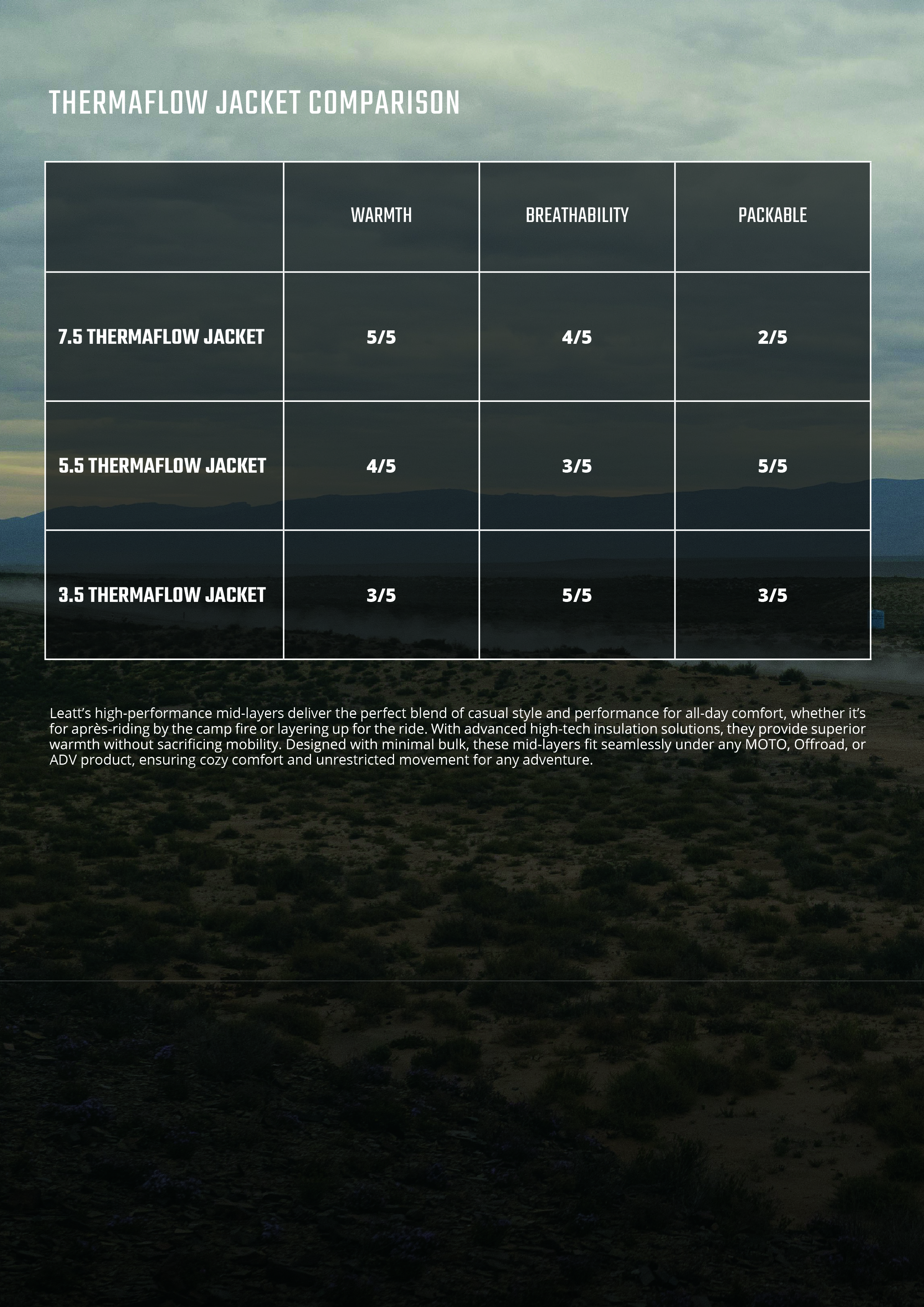 The Leatt ADV 5.5 ThermaFlow Jacket is the thinnest yet highly performing mid-layer in our ADV line a sophisticated softshell built with the latest in insulation technology. This jacket features a double knitted wind blocking shell with a unique Graphene infused 3D block fleece backing providing superior thermal management without bulk. Graphene captures heat from hot spots and redistributes it evenly ensuring maximum comfort and efficient temperature control across your entire core. With stretch ripstop reinforcements on the elbows and seat area this slim-fitting jacket is ready for the rigors of off-road riding while keeping you warm and nimble.