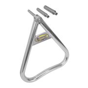 Lightweight replacement for OEM triangle stands. Tapered axle pins keep stand from falling out of axle. Three tapered axle pins accommodate most hollow axle sizes. Frame designed from 1" round aluminum tubing. Arched lower frame for stability on uneven ground.