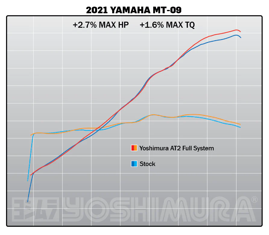 Right away the bike lost 6 pounds by removing the stock system and installing the AT2 Race Series full system. With plenty of torque on the bottom end Yoshimura focused on bringing the power more to the top of the spectrum. After development and testing was all said and done the AT2 gave the MT-09 a nice 2.7% increase in max HP and a 1.6% in max torque.